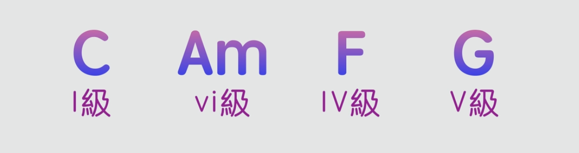 先來準備一下學習材料。我們會以常用和弦進行1645,作為今天的教學範例。以C調為例,1645的基本和弦進行就是以下這樣子: