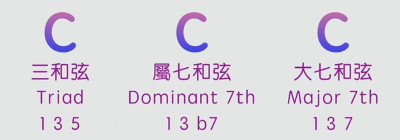 七和弦:1音-3音-屬七音 (如C-E-Bb) 或大七音 (如C-E-B)