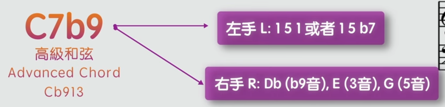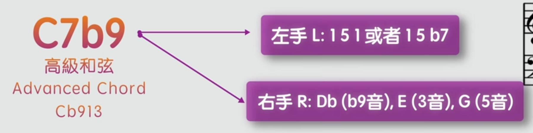 右手:彈3音 (G#), 增5音 (C,即升5音), 降9音 (F) 或升9音 (G)
