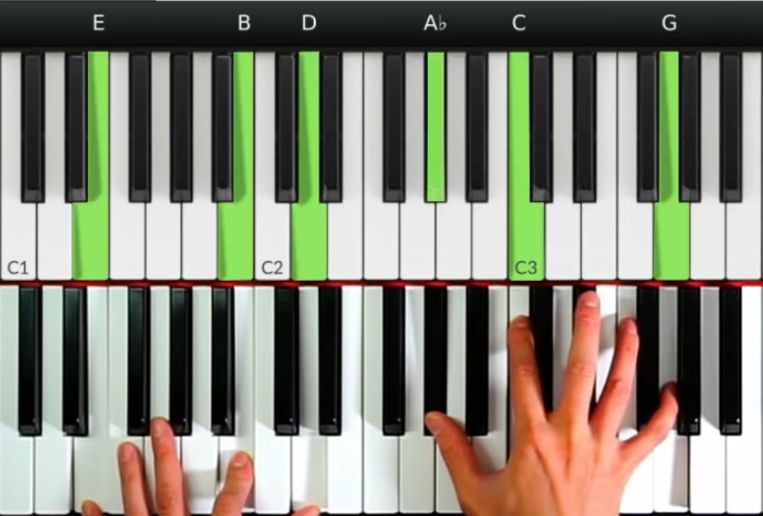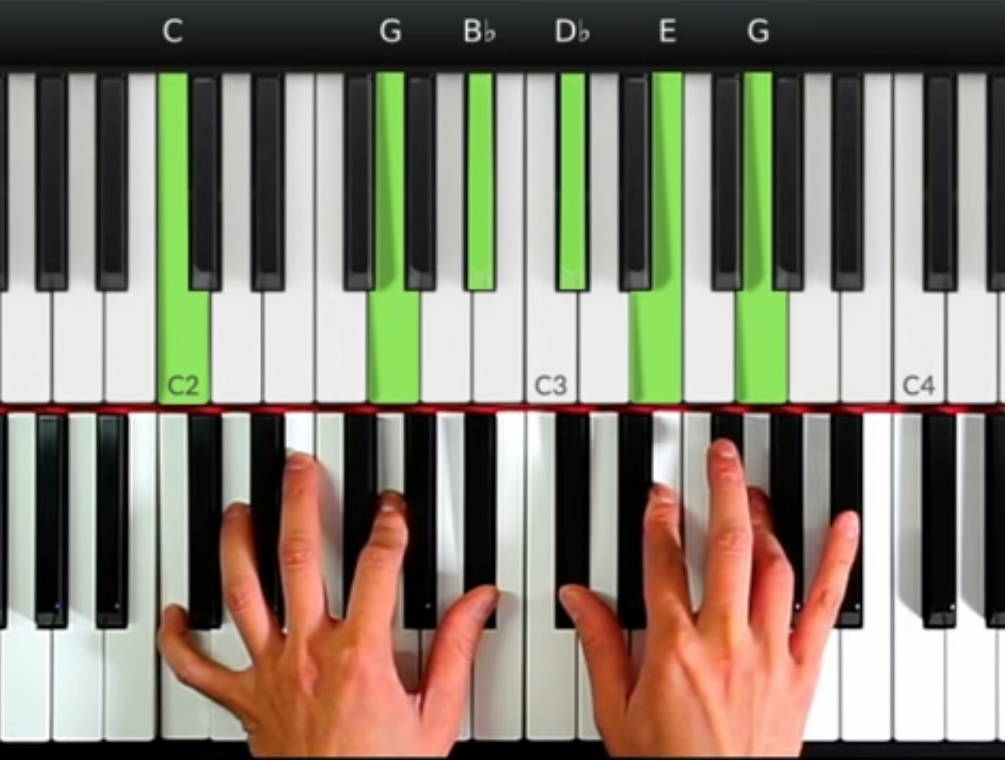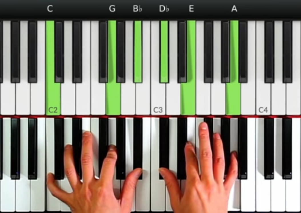 右手:彈降9音 (Db), 3音 (E) 和5音 (G)