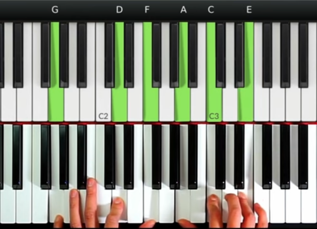 C和弦:左手低音區彈C-G-C,然後右手彈C-E-G