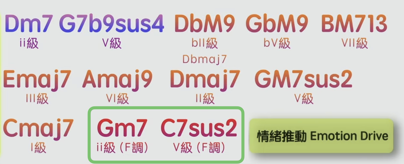 注意這個關鍵時刻! 當你彈到Cmaj7時, 你已經巧妙地回到了與原調相近的區域。這時候, 你可以順勢接一個251進行(Gm7-C7sus2-Fmaj7), 自然而然地過渡回副歌的4536251。