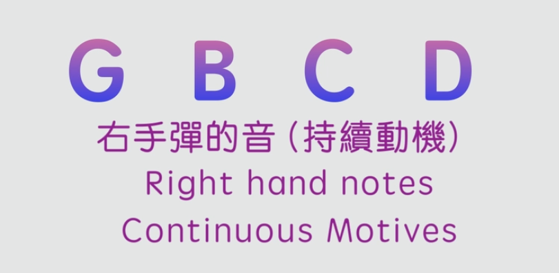 我們要開始學習如何去即興樂段。今天我要教大家一個非常有用的技巧,就是持續動機. 那什麼是持續動機呢?持續動機就是持續重複地彈奏在調性裡面固定的幾個音。我們今天就以G調裡面的GBCD這四個音,以右手來重覆彈奏,作為持續動機的範例。