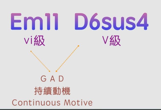 II級和弦我們用A7sus4,大家都應該猜到我之後會講什麼了吧😂:還是GAD的持續動機。