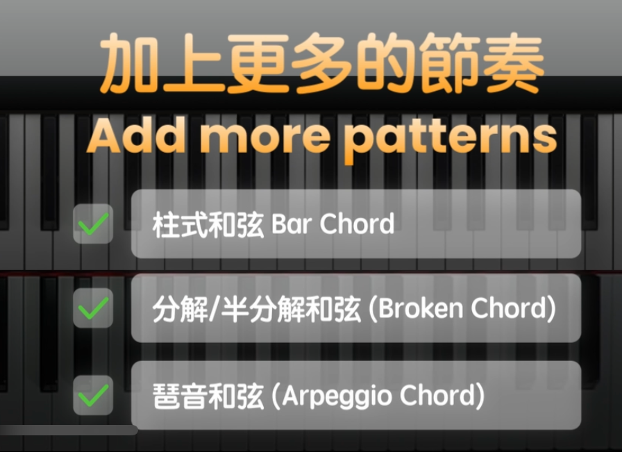 如果一直在用同一種彈奏方式來即興前奏的話,難免會令曲子顯得單調。在這個時候,就可以加入不同的彈法來讓曲子更加地精彩動聽和多變。比如可以加入柱式和弦,分解和半分解和弦,還有琶音等等的和弦彈奏方式。
