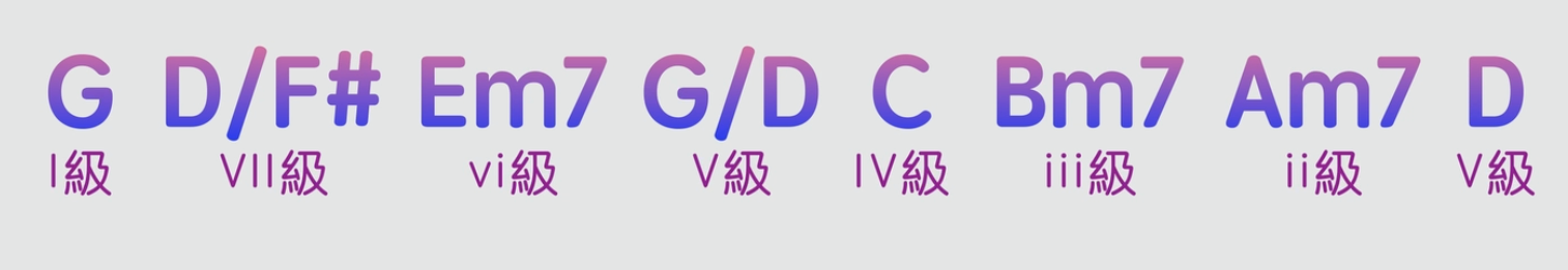 找一段簡單的和弦進行,比如1645,4536251,卡農(Canon)等等。在今天的學習裡面,我們將會以卡農進行作為例子。那麼G大調的卡農進行就是以下這樣子。