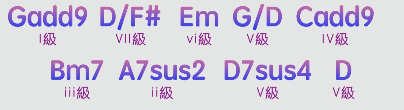 VII級和弦D/F#加上11音(G),就變成了Dadd11/F#