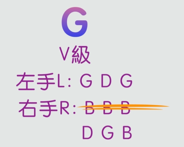 到了V級和弦G,配上旋律7 7 7的時候,指法如下: