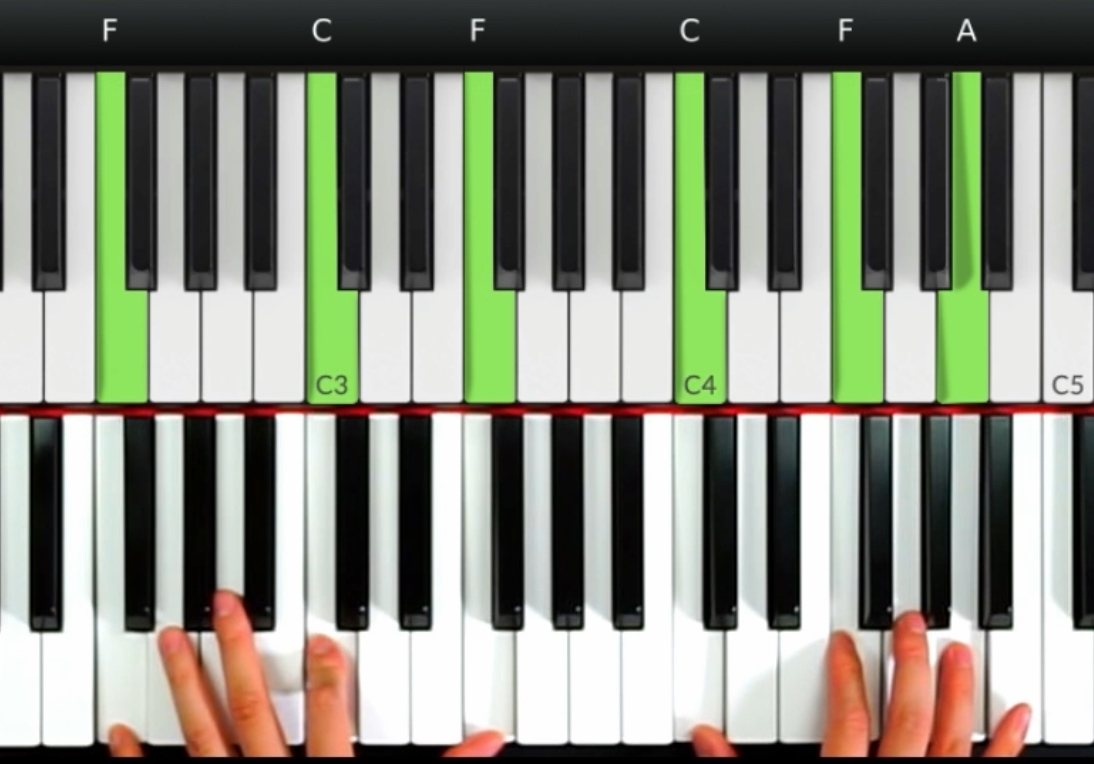 比如彈奏V級和弦F,配上一段旋律音6 6 6的時候,我們的右手就可以用F的第二轉位和弦(C F A)來彈奏,因為它的最高音剛剛好就是旋律6音(A音)。