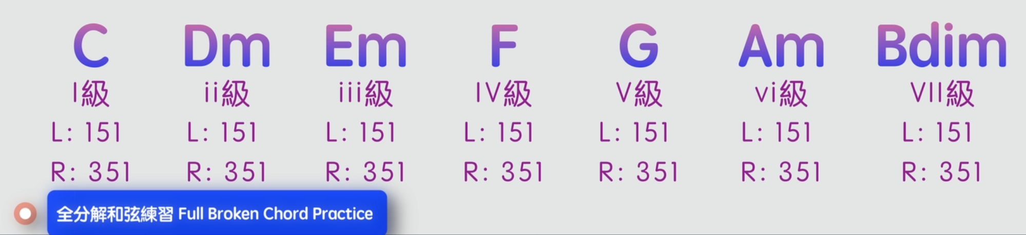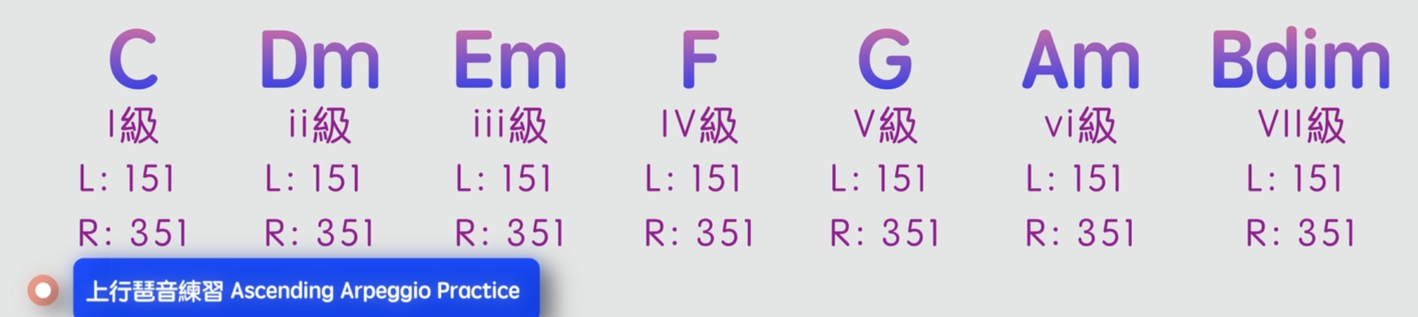 第二種練習,我們把左手移到低音區仍然用151指法來彈奏,配合右手用琶音上行的方式來彈奏每一個和弦。