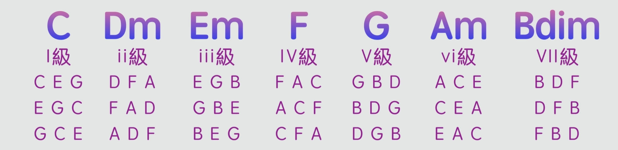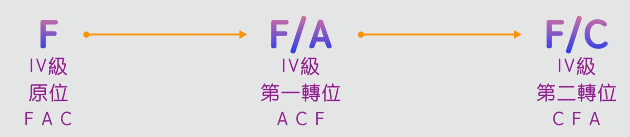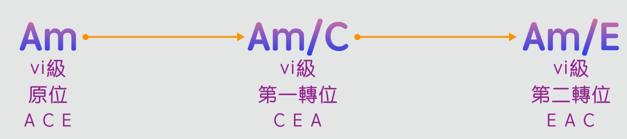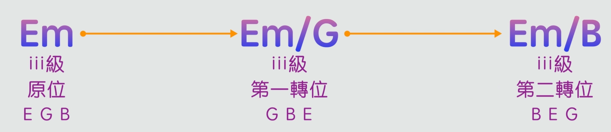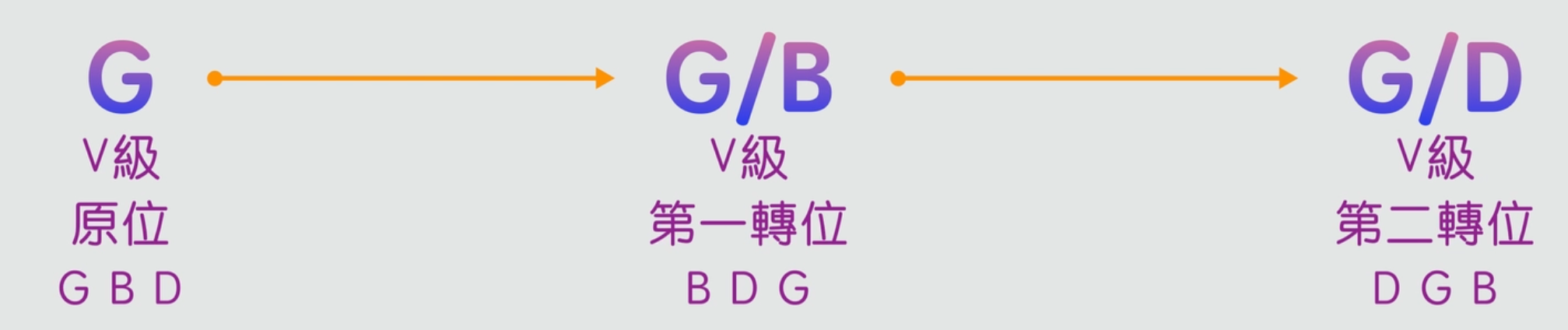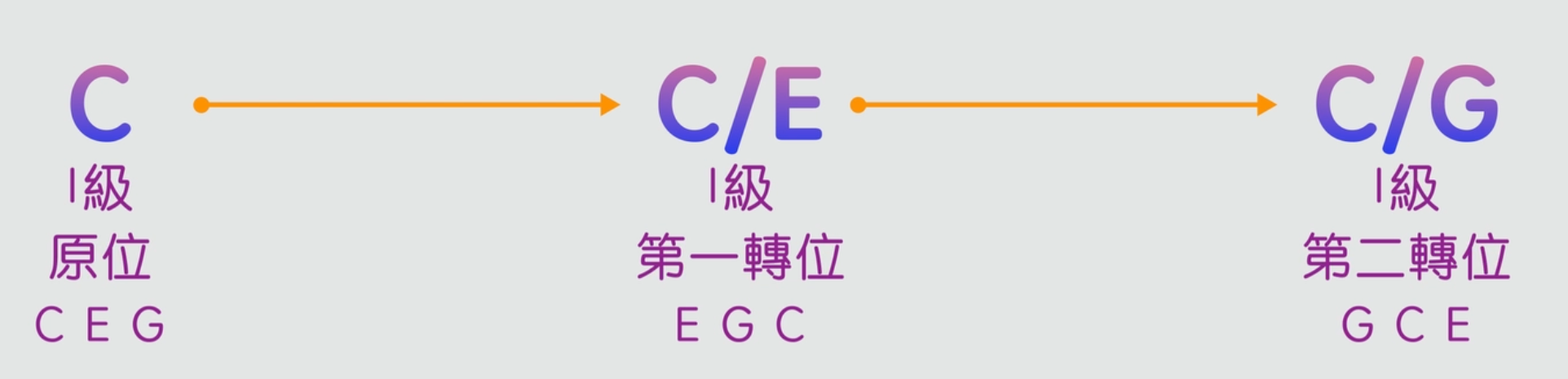 比如I級和弦C的原位和弦是C E G,那麼它的第一轉位和弦是C/E (E G C), 第二轉位和弦就是C/G (G C E)。