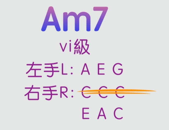 到了彈奏vi級和弦Am7,配上旋律1 1 1的時候,左右手指法如下: