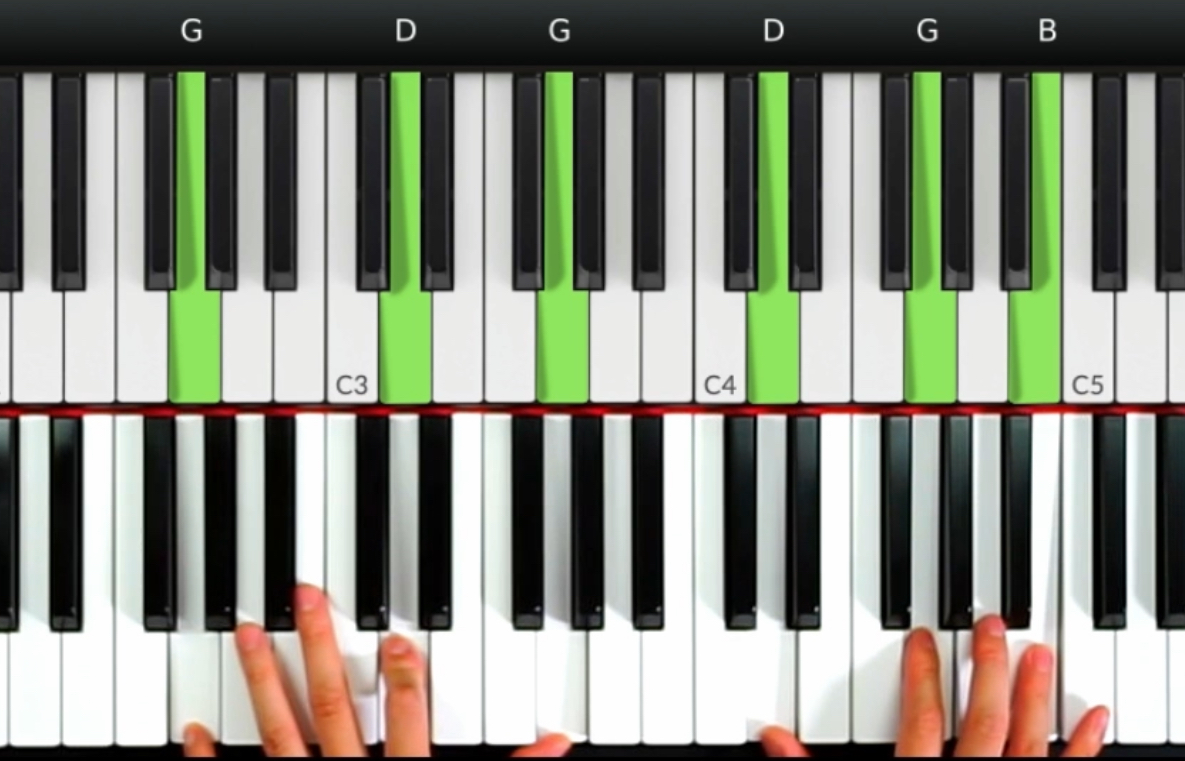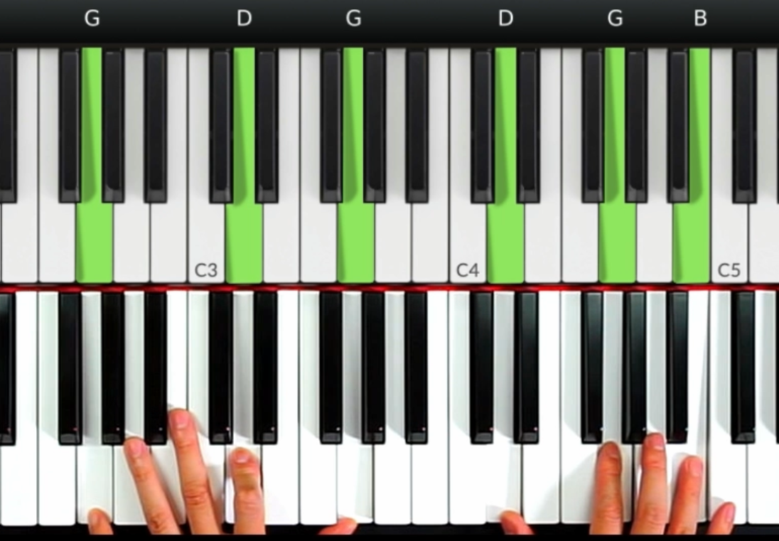 過渡到G和弦的時候,配上一段旋律7 7 7的時候,同樣道理,我們的右手彈G和弦的第二轉位和弦,因為G的第二轉位和弦 (DGB) 的最高音剛剛好就是旋律7音(B音)。
