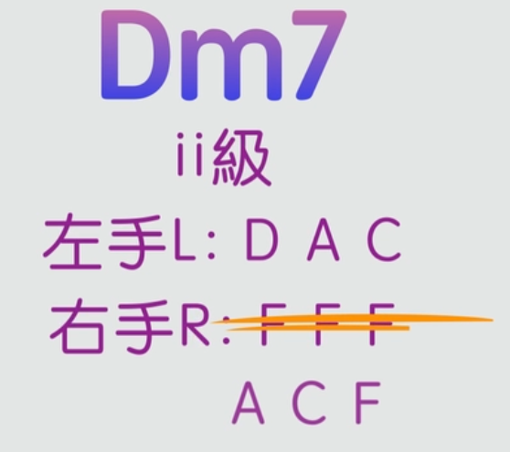 到了ii級和弦Dm7,配上旋律 4 4 4的時候,指法如下: