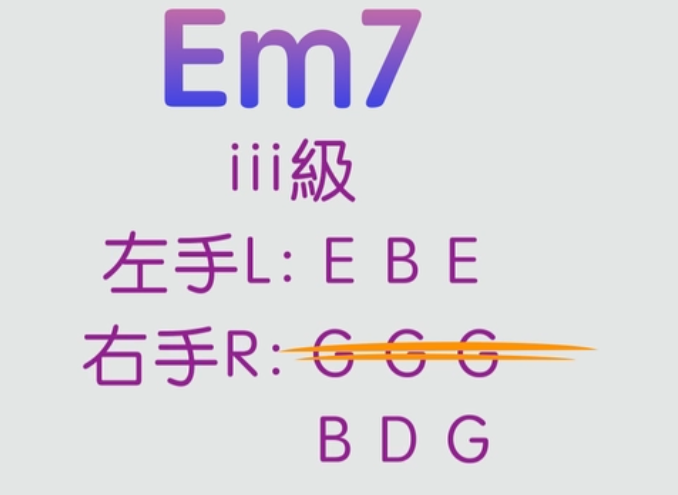 如此類推,我們繼續過渡到iii級和弦Em7時候,配上一段旋律5 5 5的話,那麼右手就彈Em7和弦的第二轉位和弦。
