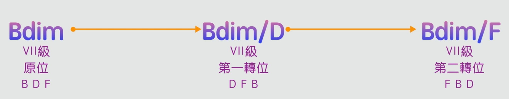 ii級和弦Dm的原位和弦是D F A,第一轉位和弦是Dm/F (F A D), 第二轉位和弦是Dm/A (A D F)。