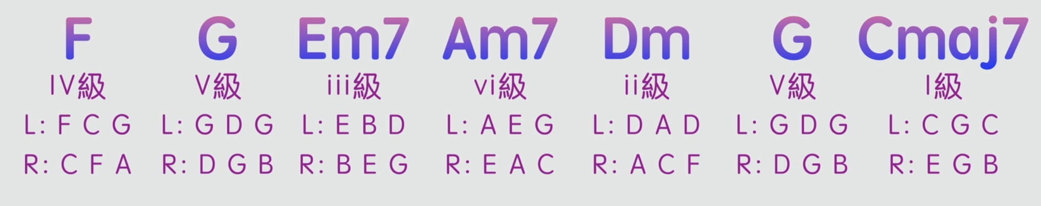 比如我們用4536251和弦進行作為範例,來體會學習一下這個『轉位和弦+旋律音』的組合彈奏