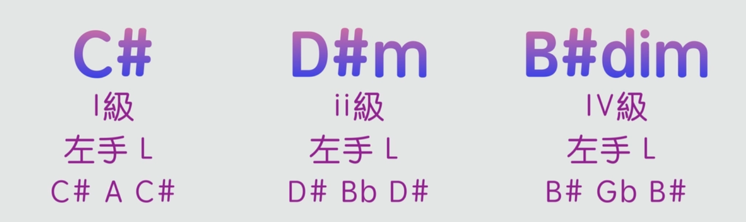 打個比方,從C調轉到C#調後,當我們彈奏I級,ii級和IV和弦。左手的151指法就會是一下這樣子,是不是跟C調的151指法有很大的區別呢?