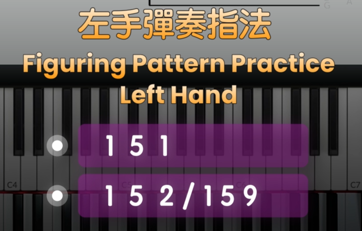 左手151的彈奏指法在之前的教學我也有提及過,我們在這裡重溫一下:比如從一級和弦到三級和弦,我們的左手用151指法來彈奏。 有一個練習的重點:每個和弦的左手都能夠快速準確地用151柱式和弦或者分解和弦指法,通過上行或者下行的彈奏方式來練習,從而能夠達到一個很好的手指肌肉記憶力。