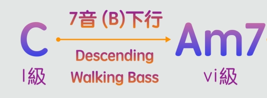 C和弦在第四拍的時候,彈多一個Bb的低音,用下行低音的方式(B - Bb - A) 來過渡到到Am7和弦。