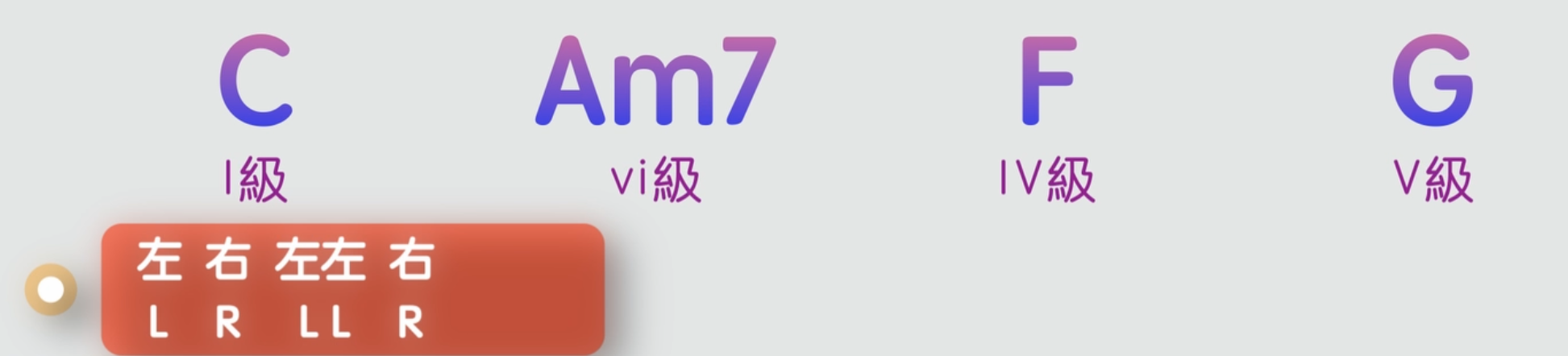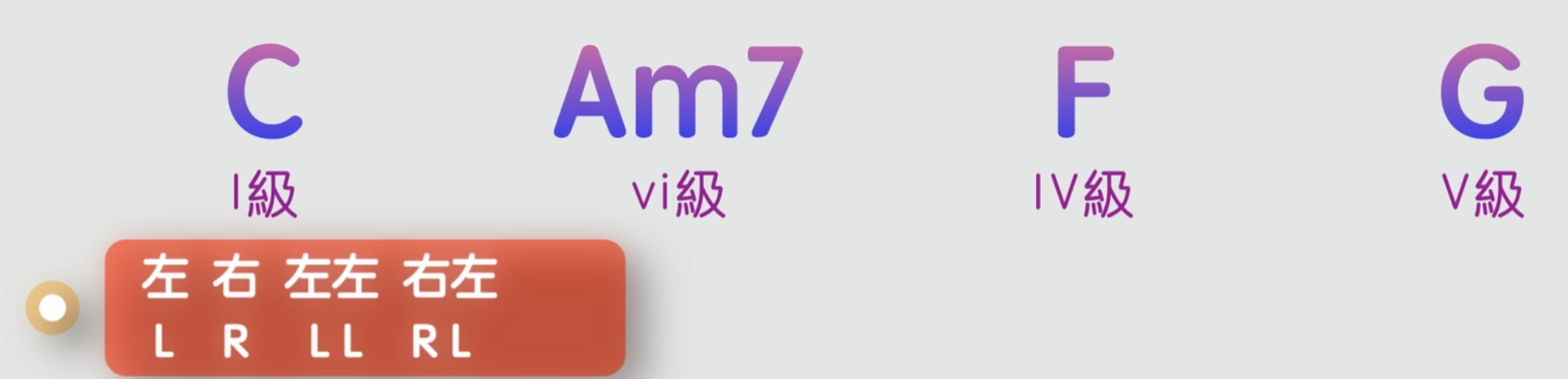 右左 R L: 右 (柱式和弦 C E A) + 左 (A E F - 換低音)