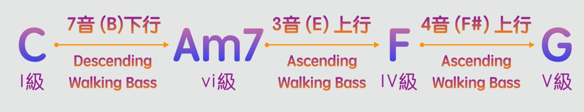 整段的1645和弦進行的換低音(Walking Bass)的彈奏就是一下這樣子。