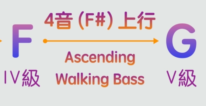 F和弦在第四拍的時候,這次我們彈A和Ab低音,用下行低音的方式(A - Ab - G)來過渡到G和弦。