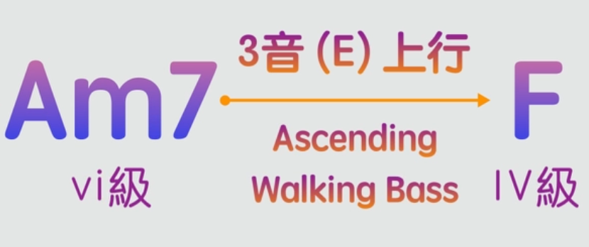 Am7和弦在第四拍的時候,彈多一個Eb的低音,用上行低音的方式(Eb - E -F)來過渡到F和弦。