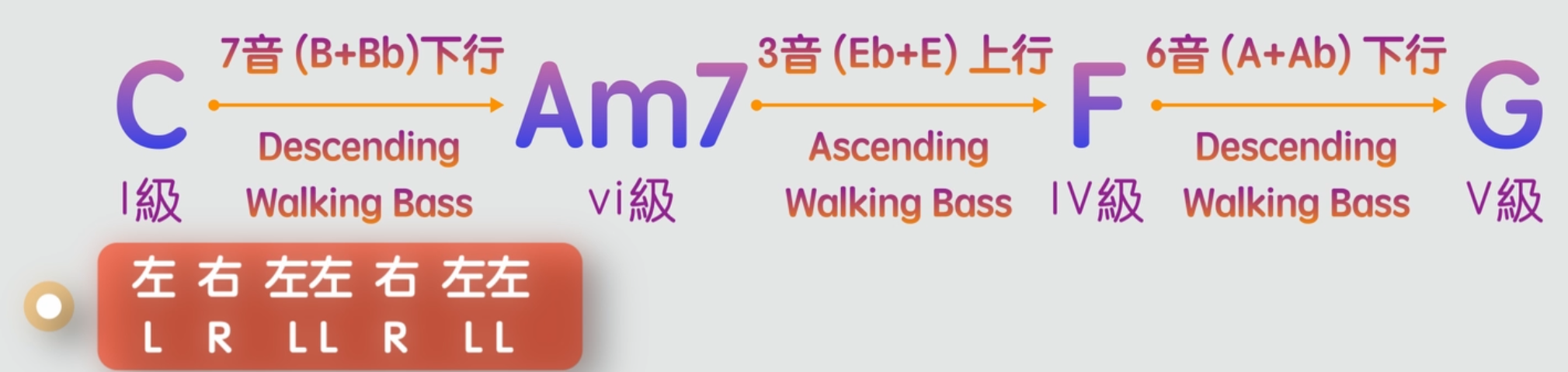但如果我們一直都用這樣的方式來彈奏的話,也難免會有點枯燥。在這個時候,我們的右手就可以來一些變化:換低音的技巧 (Walking Bass)。在換低音的技巧裡面,我們的左手就不需要用1-1指法來彈奏了,只需要彈一個音來做出低音的切換。