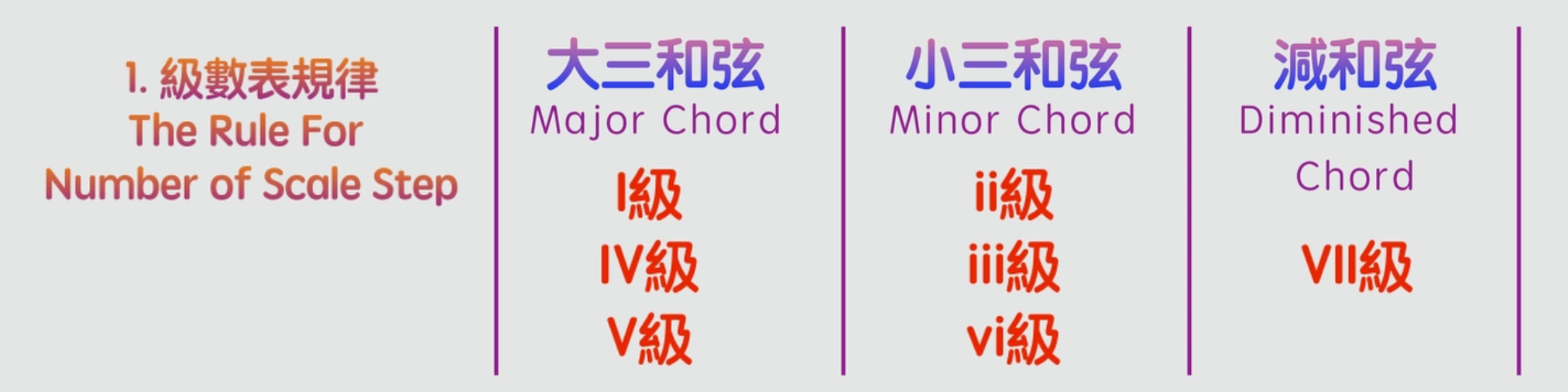 和弦級數表有一個規律,一級,IV級和V級和弦是大三和弦,ii級,iii級和vi級和弦都是小三和弦,VII級和弦是減和弦。所有的大調和弦級數都是這個規律。