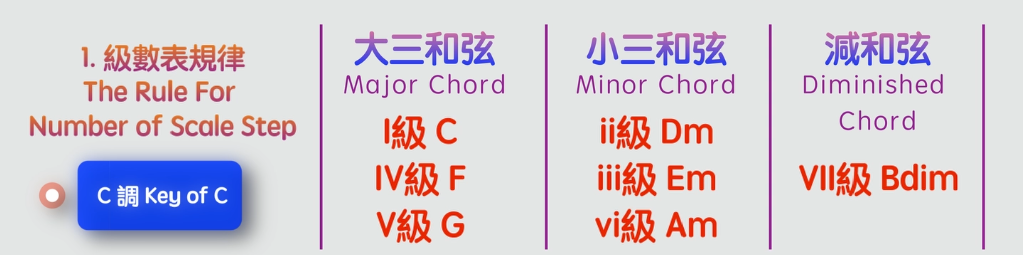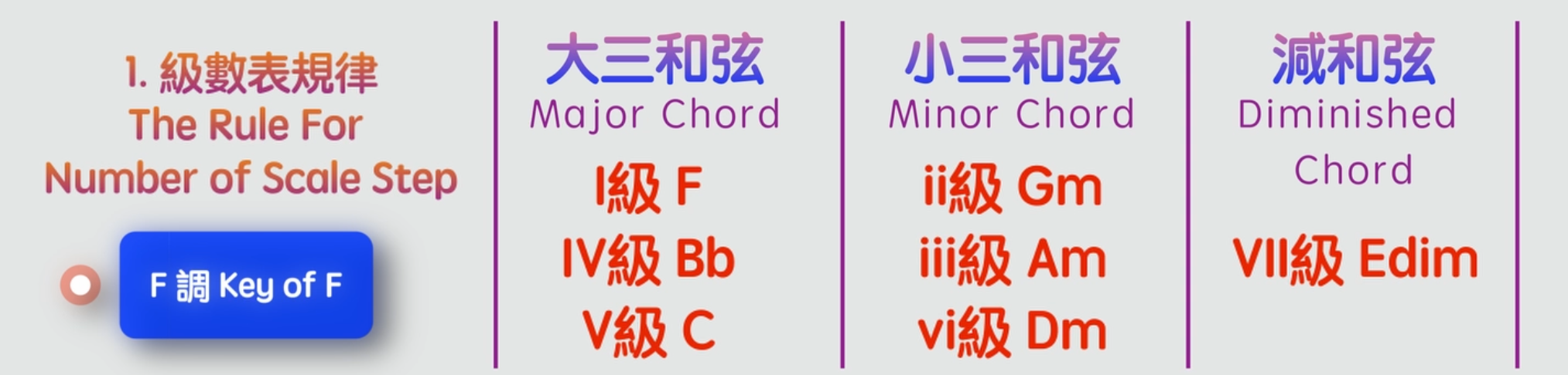 在和弦級數表的步驟裡面,我們會學習兩個非常實用的技巧,能夠幫助大家更容易地理解和熟悉和弦級數表。