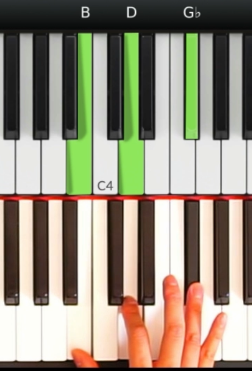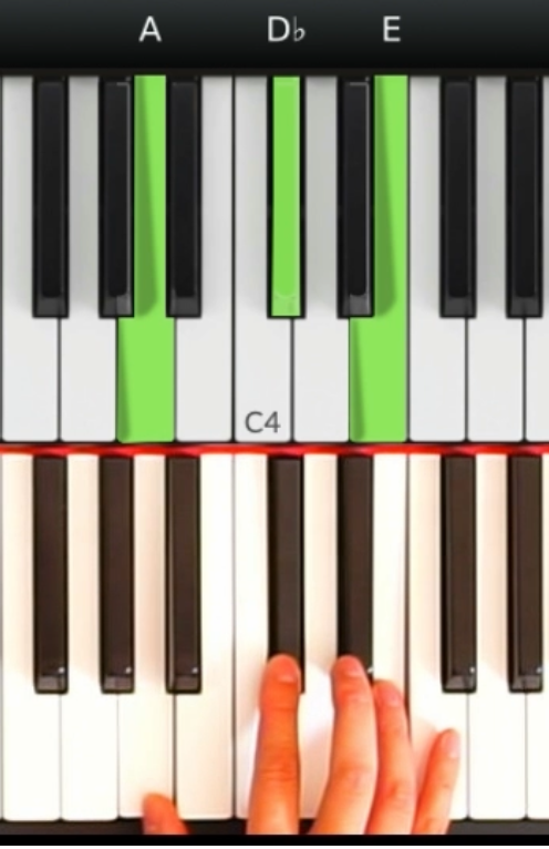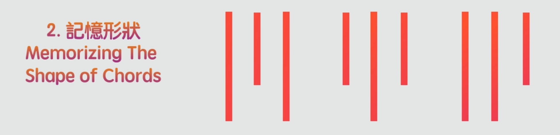 第二個很有趣的技巧是記憶形狀。比如,通常在C調裡面,和弦的形狀都是像三條平行線,沒有特別明顯的特徵。也因為沒有黑鍵,所以和弦特別地好彈。