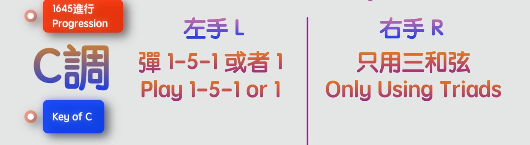 在練習的時候,我們可以先不用考慮複雜的和弦,只用三和弦彈奏。比如1645和弦進行,右手只用三和弦彈奏,左手用1-5-1指法,或者就僅僅用一根手指來彈奏跟音,用自己熟悉的節拍來比如4/4拍來練習。