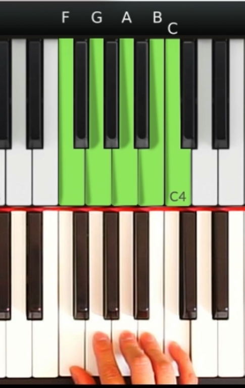 當我們彈第4音(F) 的時候,我們大拇指需要向右挪動, 同時間移動其他所有的手指,令食指可以接着彈5音(G),中指彈奏6音 (A),無名指彈奏7音 (B),最後無名指彈奏高八度的1音 (C), 來完成整段的音階右手彈奏。