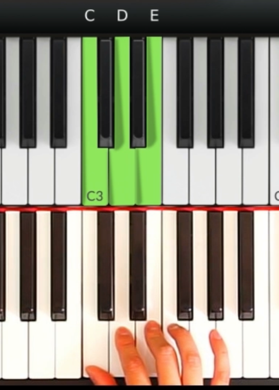 比如以C調為例,我們的右手用上行音階彈奏的時候,需要確保正確的指法順序:拇指,食指和中指分別彈1音 (C), 2音 (D) 和3音 (E).