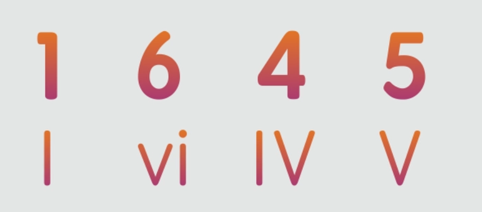 掌握了和弦級數表後,我們現在就來實戰應用一下。譬如我們隨便挑一個和弦進行:1645,以和弦級數表顯示的話,就是I - vi - IV - V。