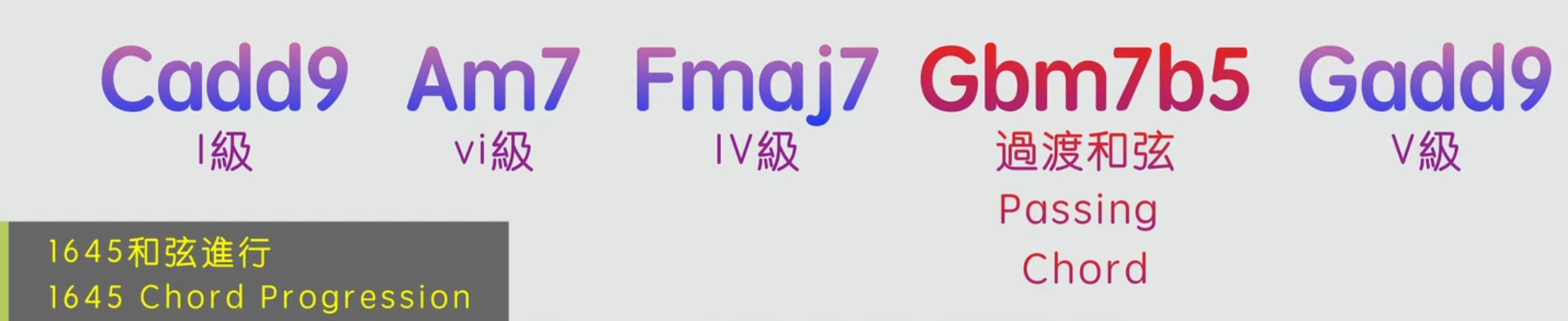 在大和弦Fmaj7和Gadd9之間, 就可以加入一個半音上行的Gbm7b5 (半減七和弦), 讓過渡更順暢!
