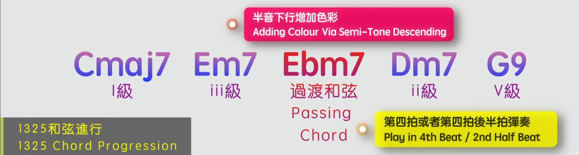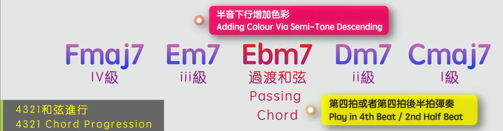 這樣一來, 和弦的連接會有一種半音下行的流暢感, 聽起來更加細膩!