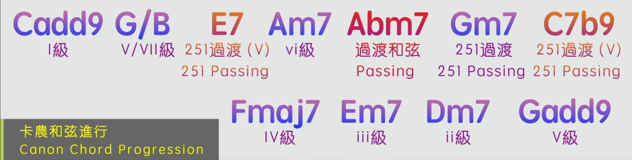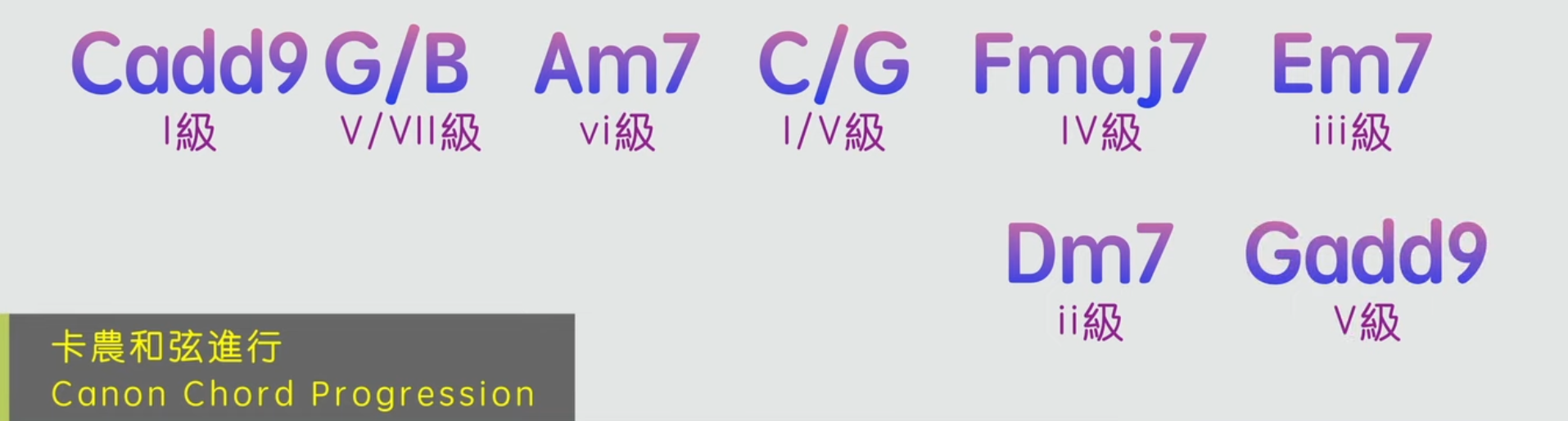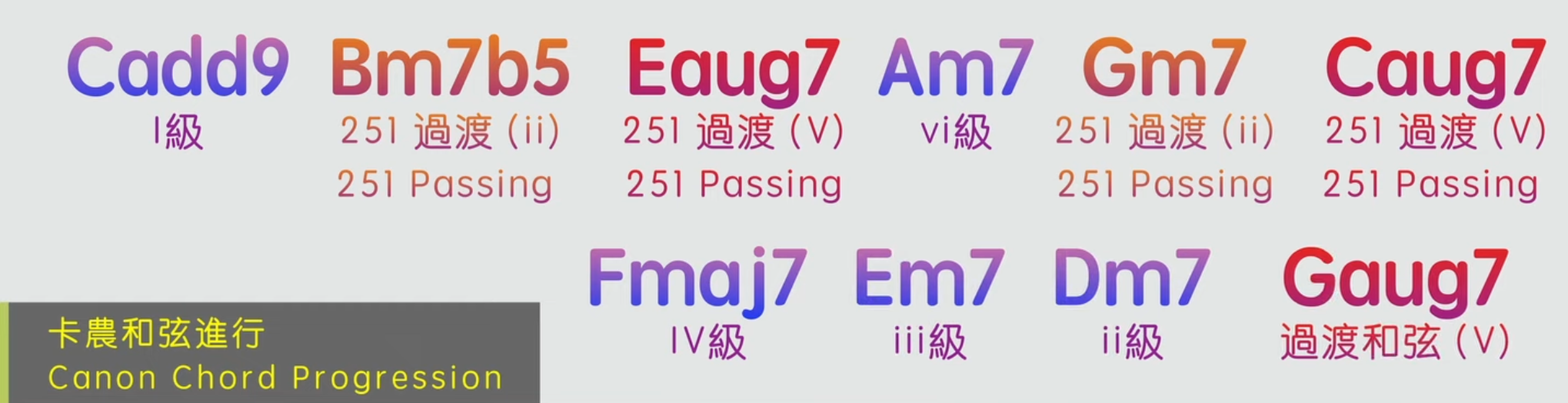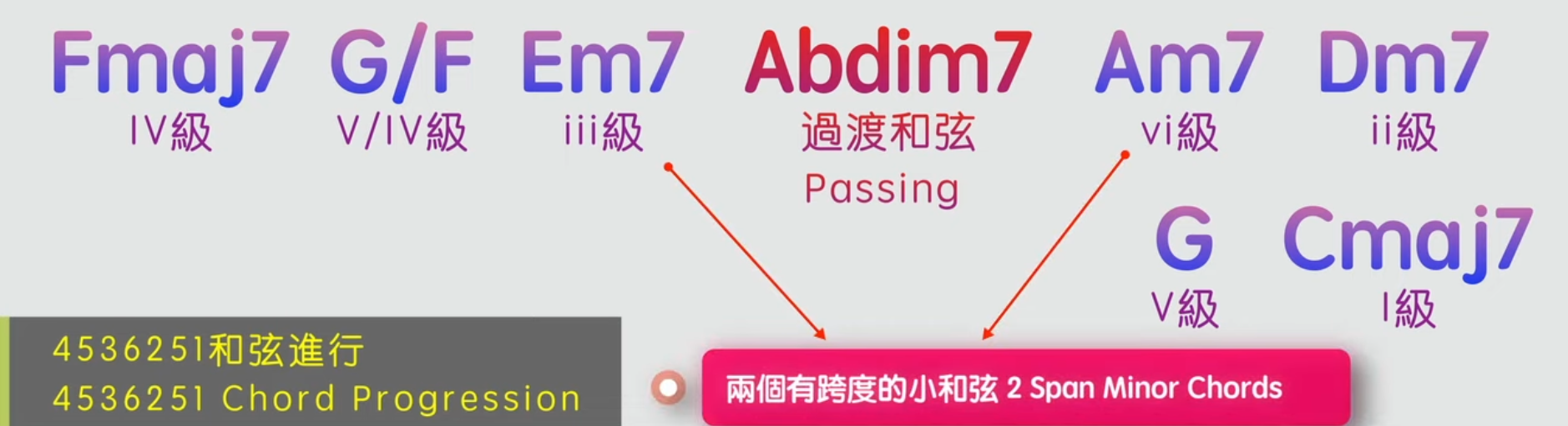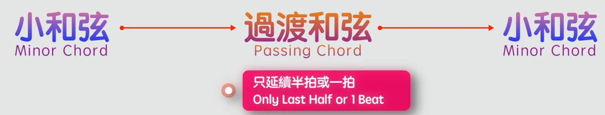 所以我們在這些例子裡面可以總結到,在兩個小和弦中間,我們可以在中間加入另外一個小和弦,作為過渡和弦。