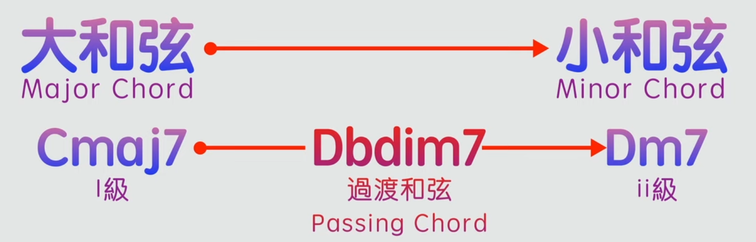 在大和弦Cmaj7到小和弦Dm7中間,就可以加入一個半音上行的減七和弦Dbdim7,來過渡到Dm7和弦。