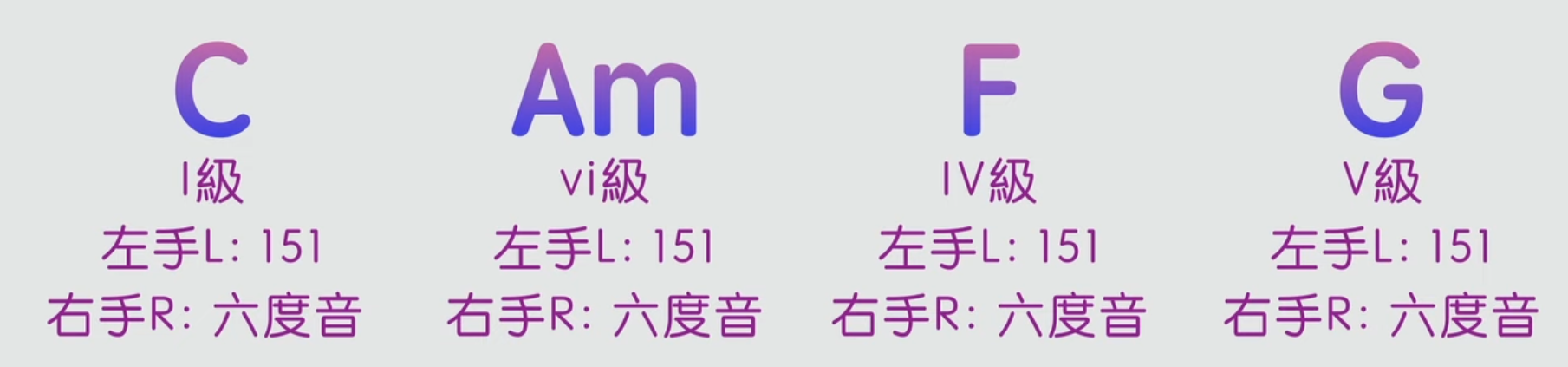 1. 左手彈根音-五音-根音(151)的固定模式
