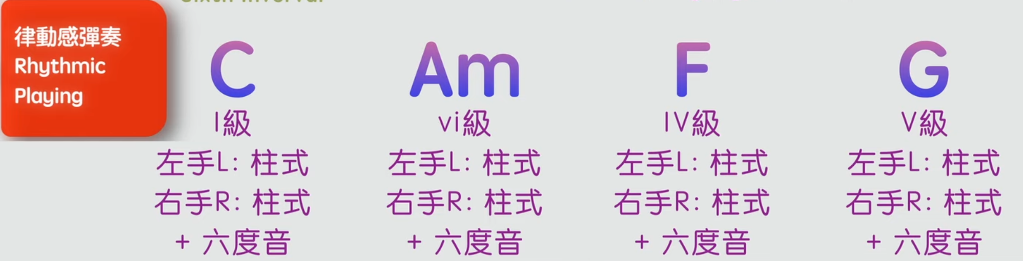 - 先彈奏柱式和弦,接著加入六度音