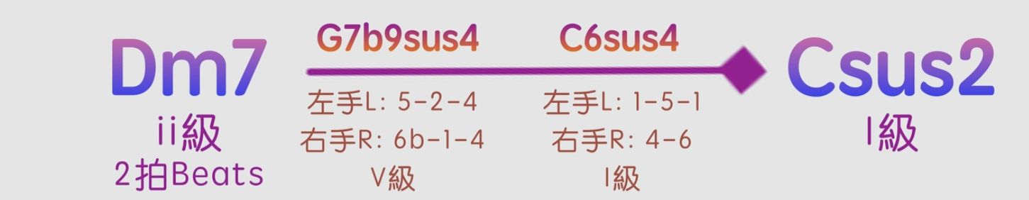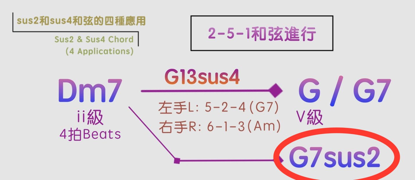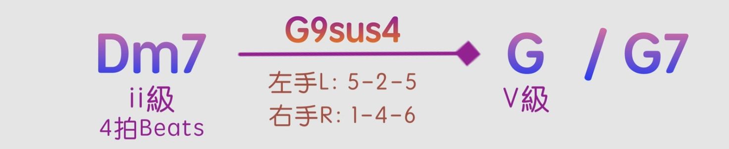 在Dm7 - G - C的251和弦進行裡面,Dm7解決去到G和弦的時候就可以用一個屬七降九掛四和弦來代替G和弦,就是G7b9sus4。