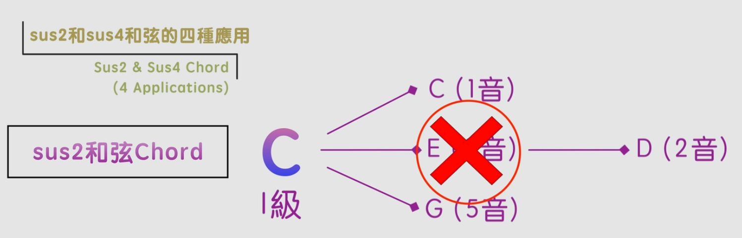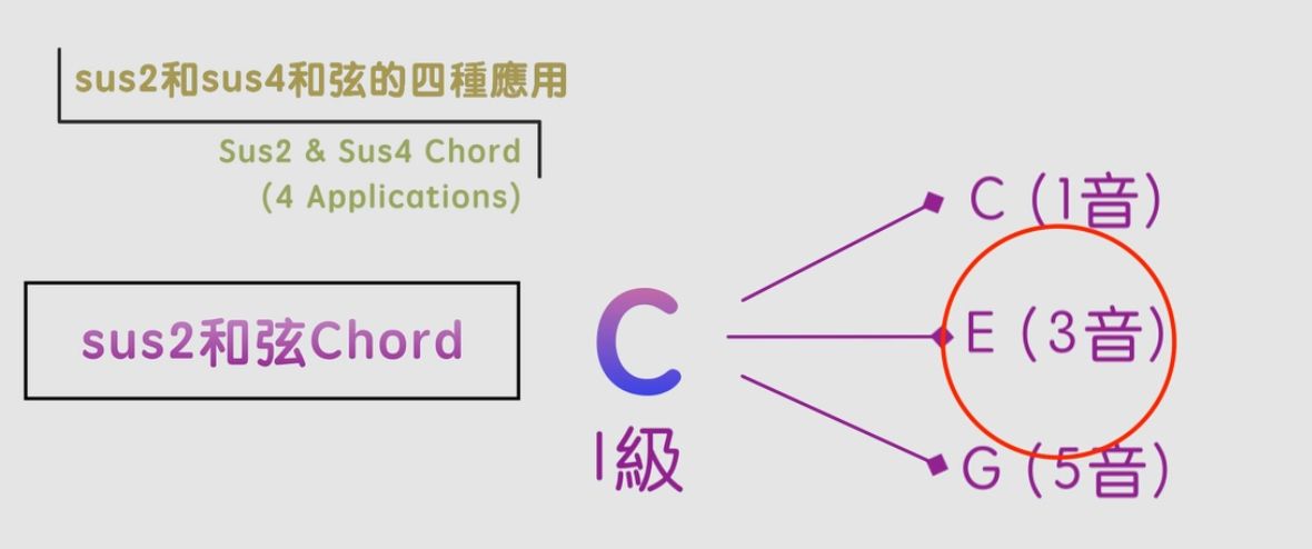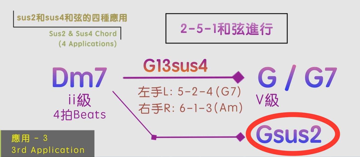 因為當我們彈sus4和弦的時候,它會產生一種緊張度,想要解決到I級和弦,所以當我們彈奏這兩個sus4和弦,來解決到Csus2的時候,就能夠創造出一種雙重的緊張度,令歌曲的和弦進行變得更加豐富和大大增加地和弦色彩!