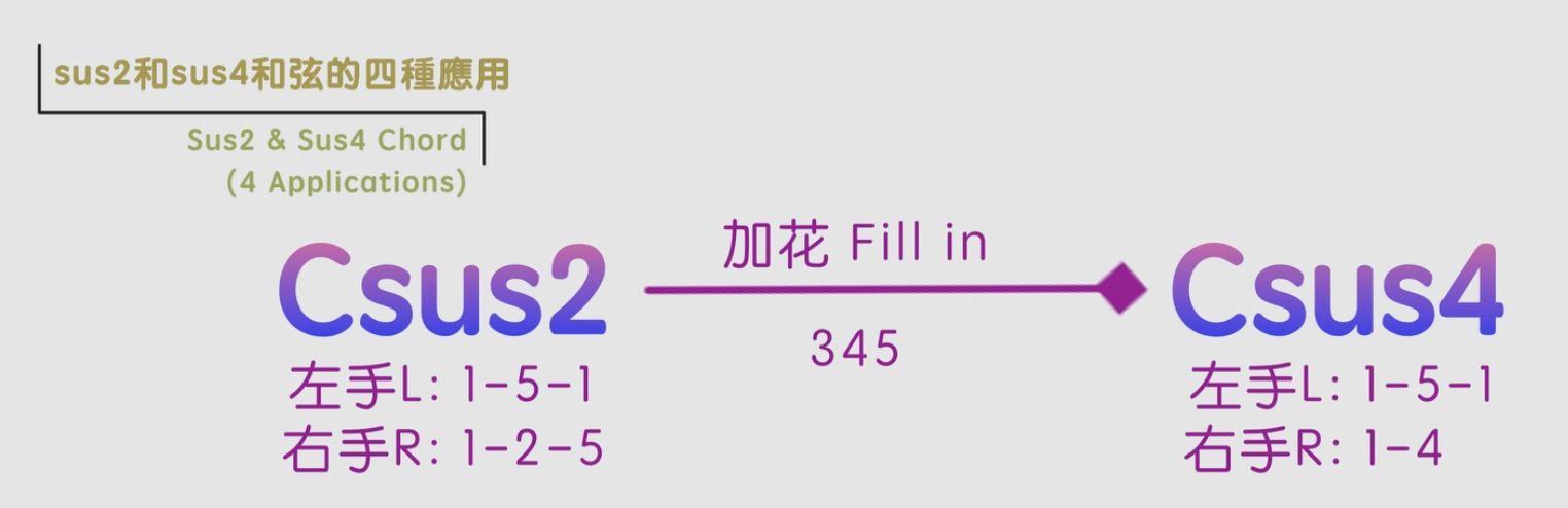 第一種應用,就是同時間使用sus2和sus4和弦。以C調為例,在歌曲的前奏(Intro)彈奏裡面,我們就可以用Csus2 - Csus4這個非常好聽的和弦進行,而且中間可以彈一些加花音(Fill in),比如345,令sus2過渡到sus4和弦的時候,顯得更加地流暢和自然。