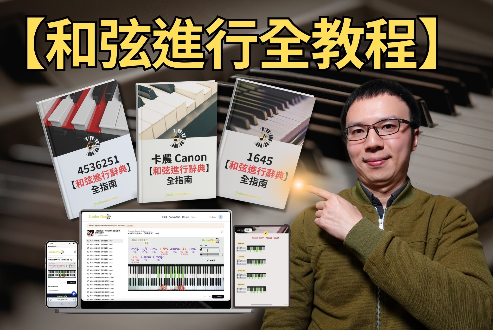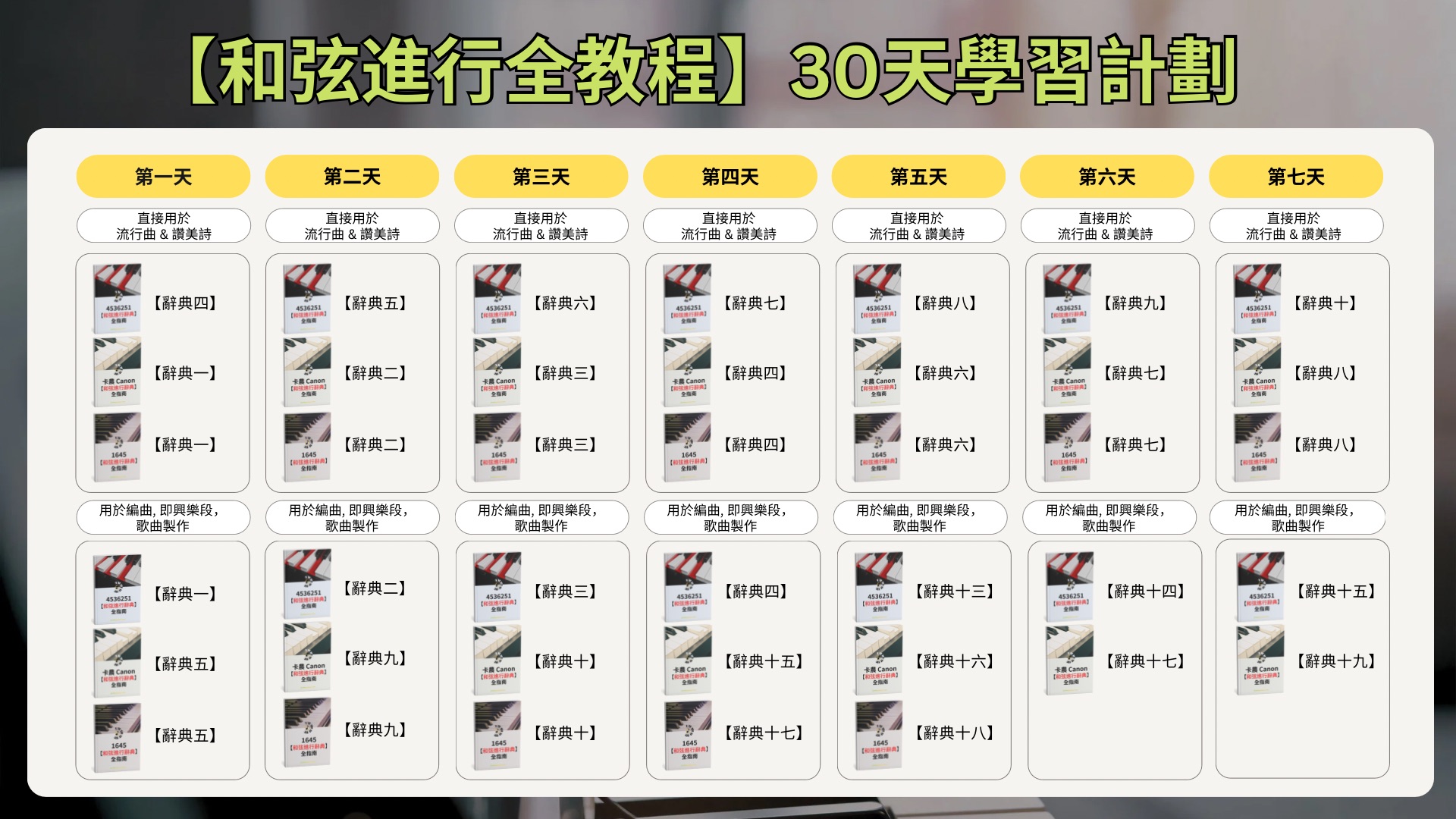 【流行鋼琴和弦進行全教程】包含4536251 + 卡農 + 1645這三大熱門和弦進行的高清彈奏教學, 加上30天學習計劃, 為忙碌的你量身打造, 幫助你輕鬆高效地練習和掌握和弦進行的伴奏!