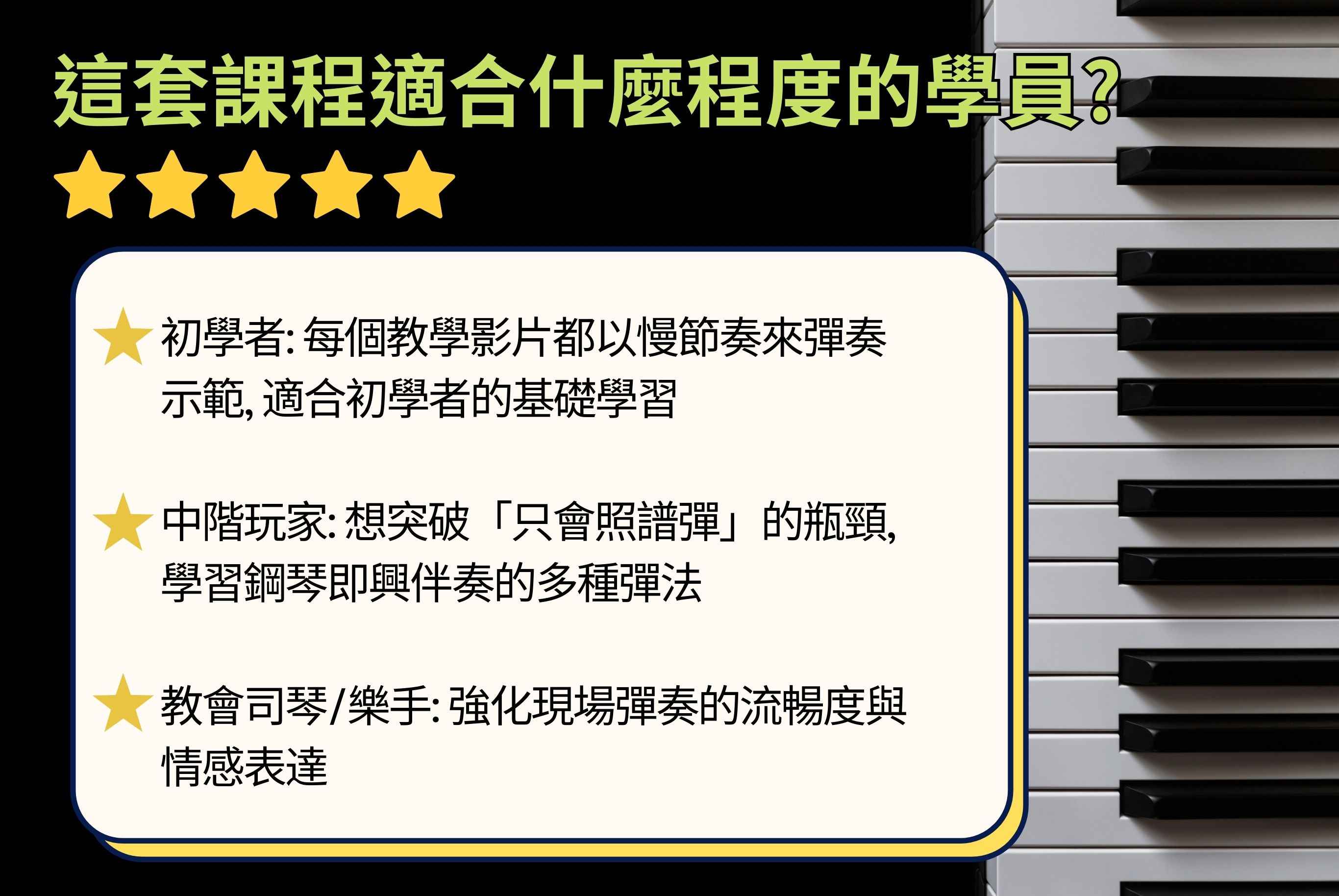 鋼琴伴奏初學者, 中等階段的學員,或者有經驗的鋼琴手/教會司琴/舞台樂手。