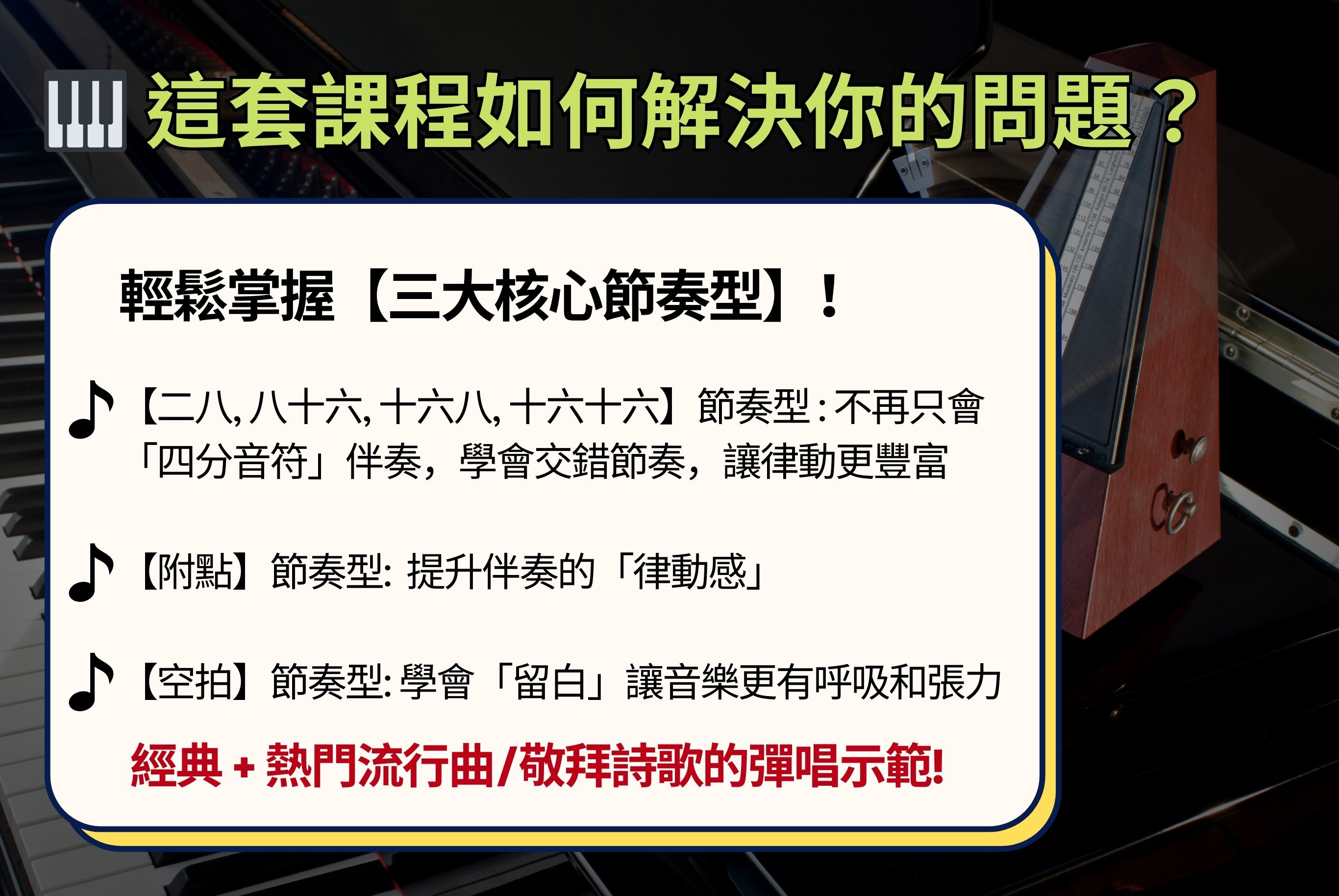 完全沒問題!課程以「實戰彈奏應用」為主,跳過複雜理論,直接教你各種節奏型彈奏。